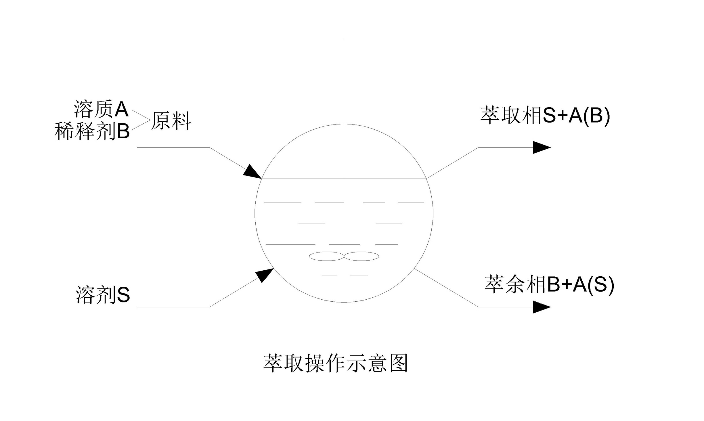 以A表示原混合物中的易溶組分,稱為溶質;以B表示難溶組分,稱為稀釋劑。由此可知,所使用的溶劑S(或稱萃取劑)必須滿足兩個基本要求:①溶劑不能與被分離混合物完全互溶,只能部分互溶;②溶劑對A、B兩組分有不同的溶解能力,或者說,溶劑具有選擇性:
