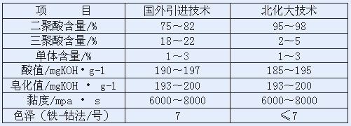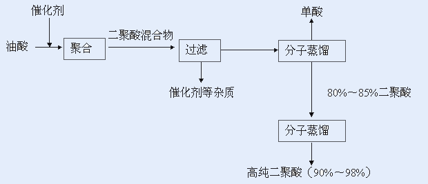 高純二聚酸的生產,其關鍵在于后提純工藝。目前,許多工廠二聚酸的純化采用真空蒸餾法,生產中存在蒸餾溫度高、受熱時間長、分離效率低等缺點,所得產品色澤差、純度低、單酸含量高,產品純度僅達70~75%。