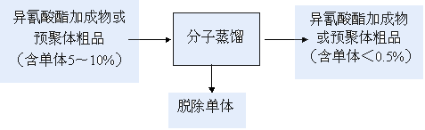 異氰酸酯聚合物粗品中含單體5~10%,傳統的處理方法是采用簡單真空蒸餾處理,產品中單體的含量只能達到2~3%,若采用分子蒸餾,可將單體含量降至0.5%以下。