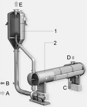 A = Product B = Concentrate C = Condensate D = Heating steam E = Vapour 1 = Flash vessel/separator 2 = Heat exchanger